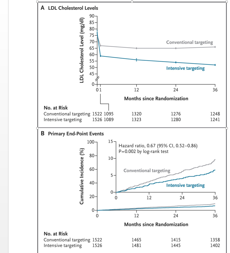 Araştırmaya kişiler alınırken başlangıçta ortalama LDL seviyesi 76mg/dl imiş. Takiplerde sonuçlara ilaçlar arttırılarak hedefe ulaşılmaya çalışılmış. Hedefe 3 sene sonunda %60-65 hastada ulaşılmış. LDL oranları ortalama 65 ile 55 olarak başarılabilmiş.