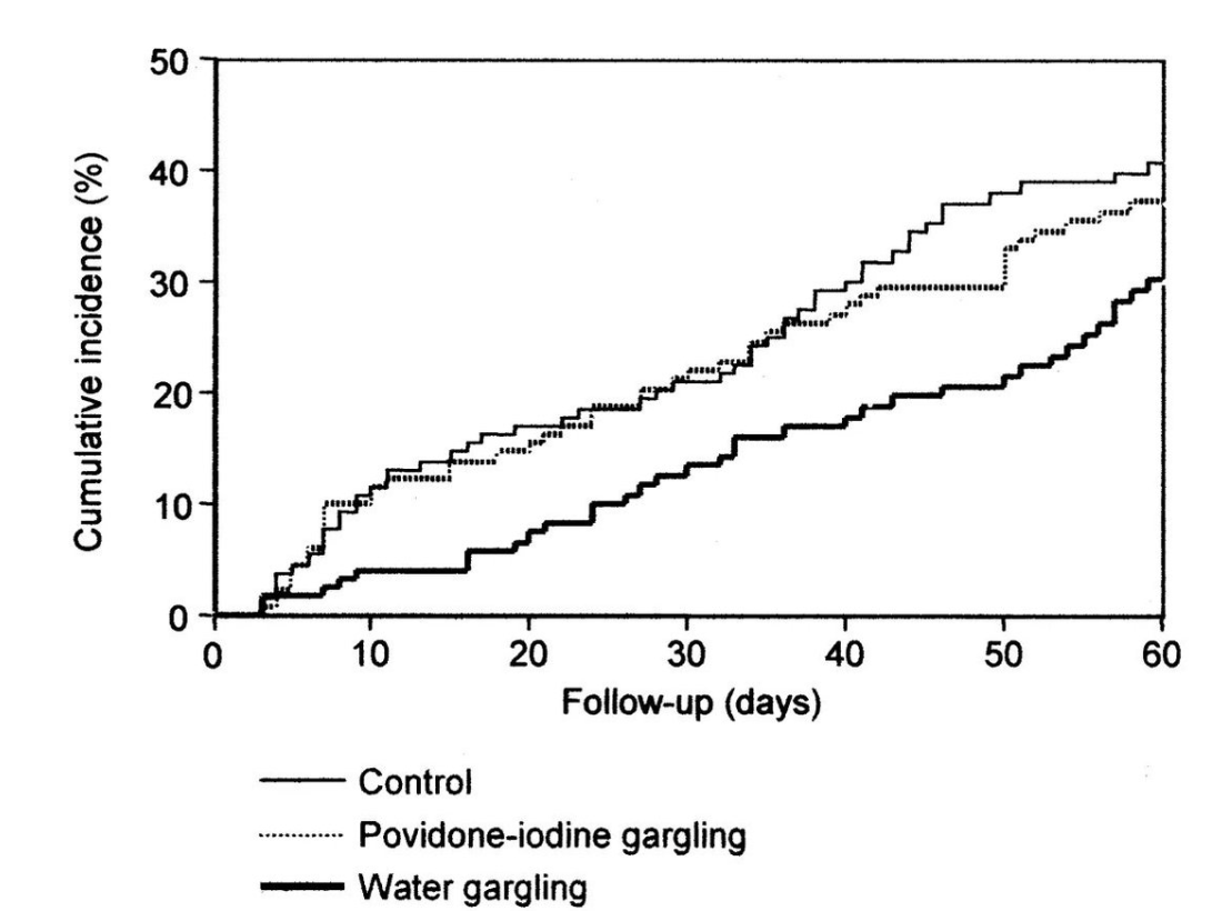 Birinci grup ilave hic bir şey yapmamış. İkinci grup günde 3 kere suyla, son grup ise günde 3 kere betadine/tentürdiyot ile gargara yapmışlar. 60 gün izlem sonrasında katılanların 130’unda üst solunum yolu enfeksiyonu gelişmiş. Gruplardan düzenli olarak suyla gargara yapanlarda enfeksiyon gelişim orani en düşük kalmış.. Suyla gargara yapan ve enfeksiyon gelişenlerde, enfeksiyonun akciğere inmesi de azalmış.